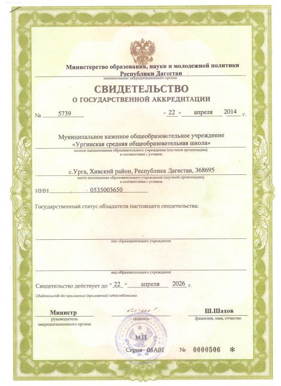 | Адрес местонахождения образовательной организации* | 368695 РЕСПУБЛИКА ДАГЕСТАН РАЙОН ХИВСКИЙ СЕЛО Урга, Ул. Центральная 19. |